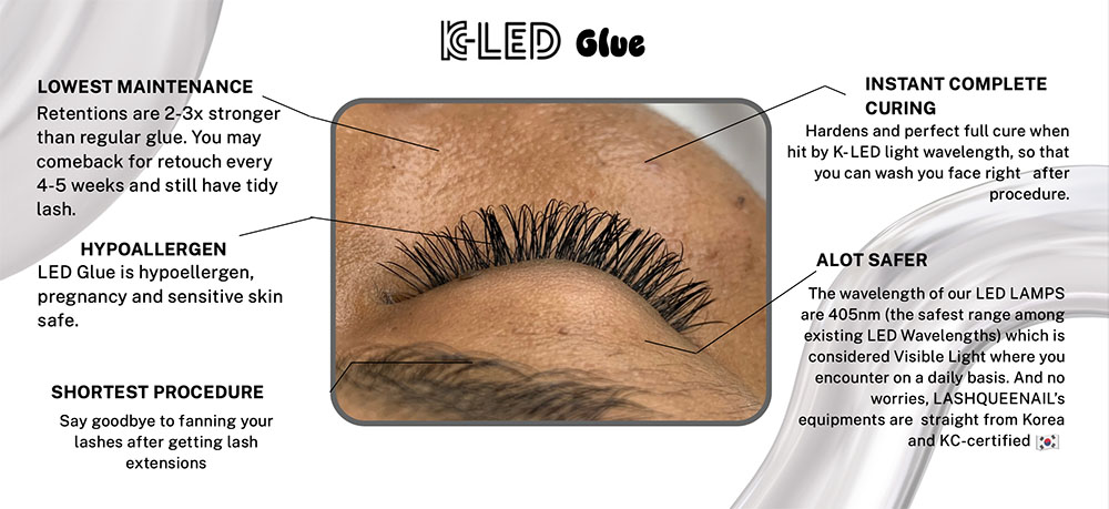 K-LED LASH is a a new Eyelash Extensions technique using special adhesive that cures completely in 2 seconds when LED